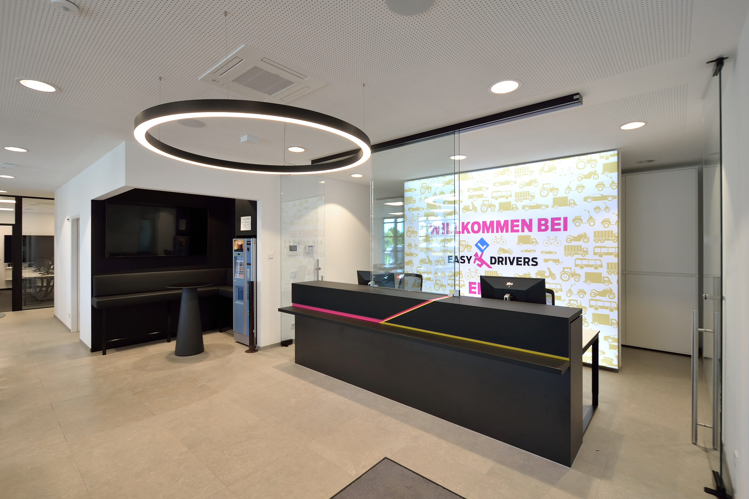 Das Interieur von Easy Drivers Enns überzeugt durch klare Linien, Transparenz und moderne Materialien. Der Empfangsbereich mit seiner markanten schwarzen Theke und leuchtenden Farbakzenten setzt ein dynamisches Statement.
