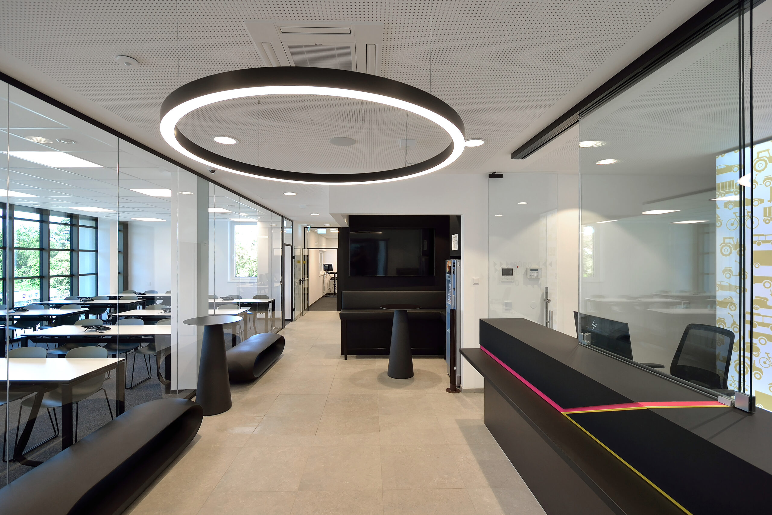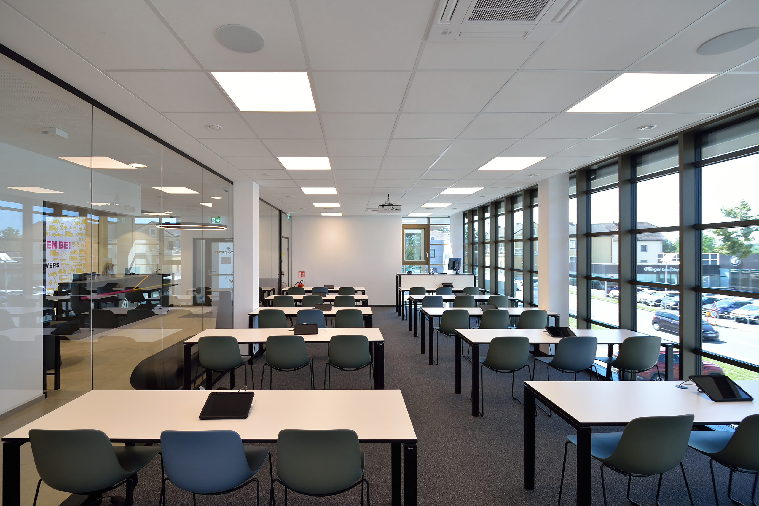 Glaswände und gezielte Lichtführung schaffen Offenheit und Struktur, während helle Schulungsräume mit großzügigen Fensterflächen ein angenehmes Lernumfeld bieten.