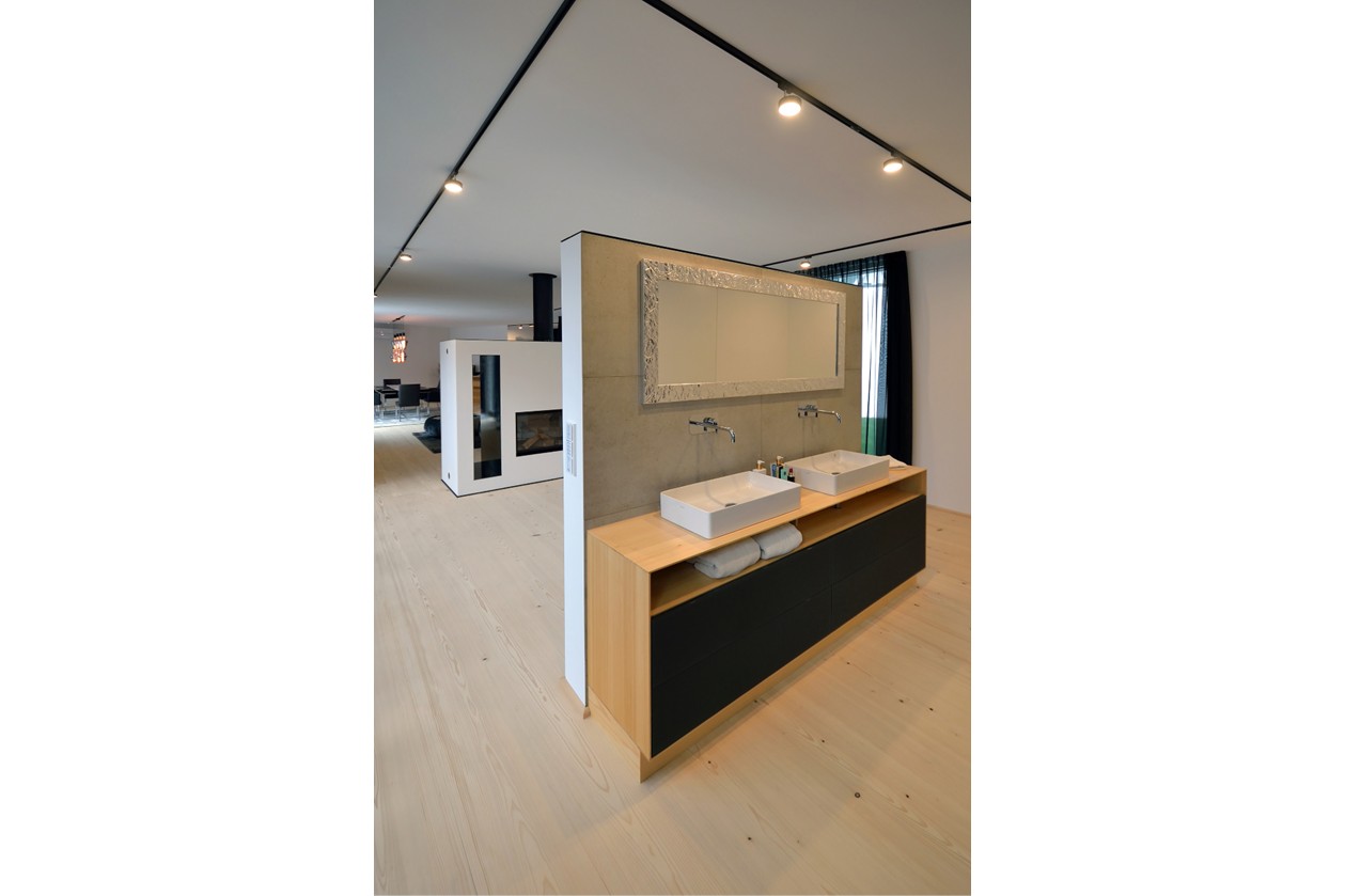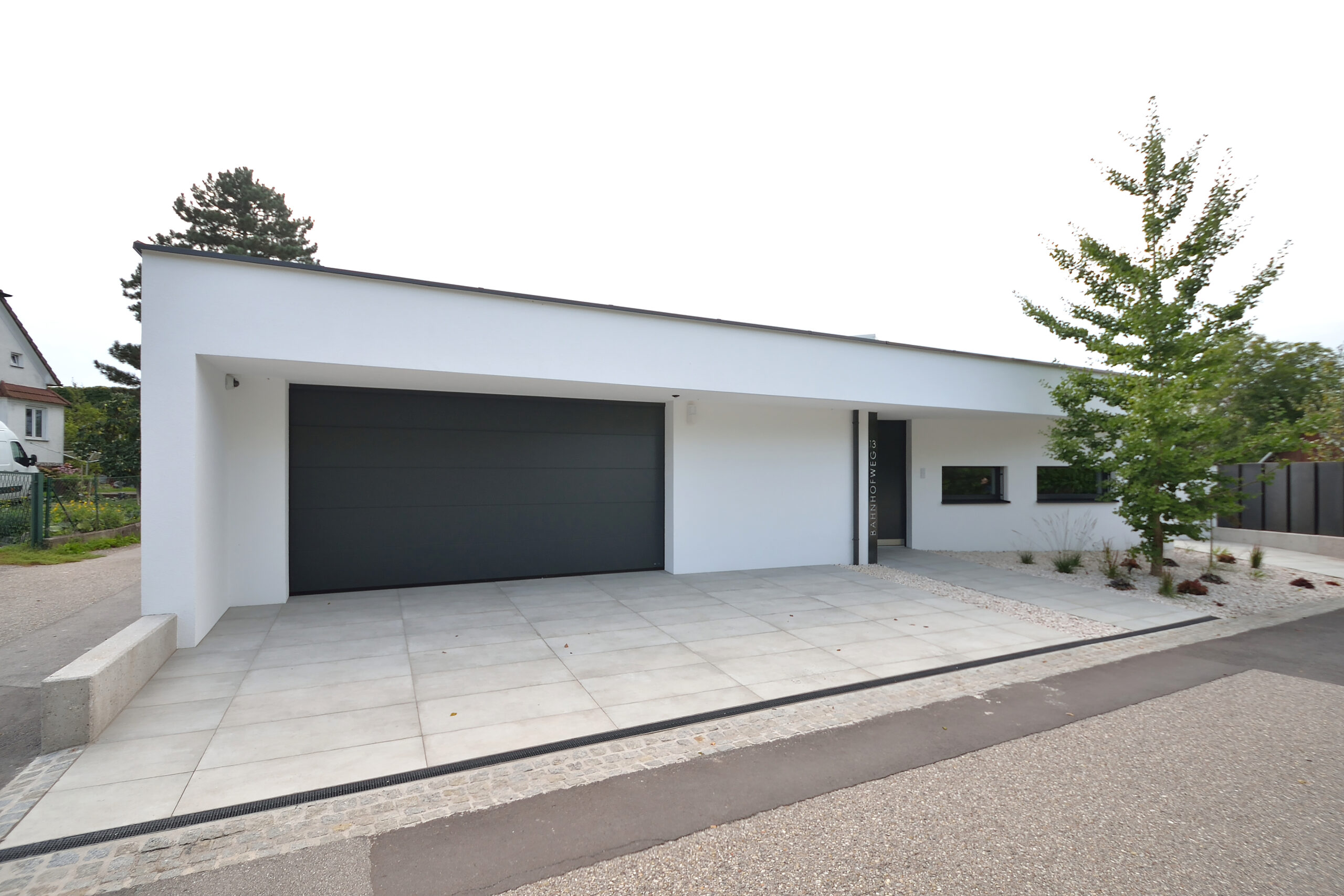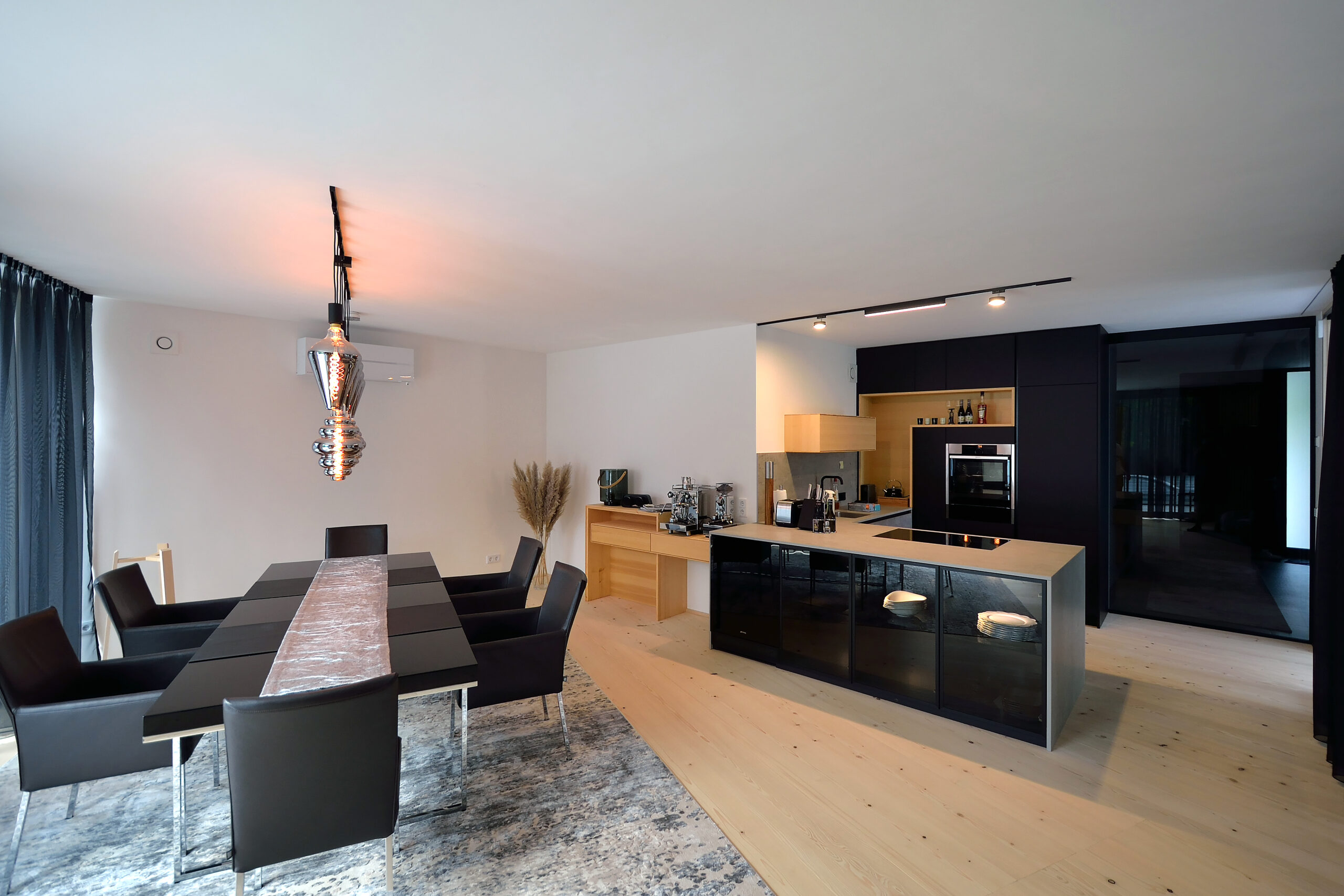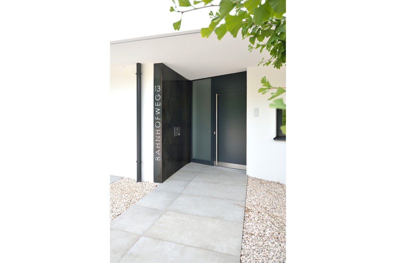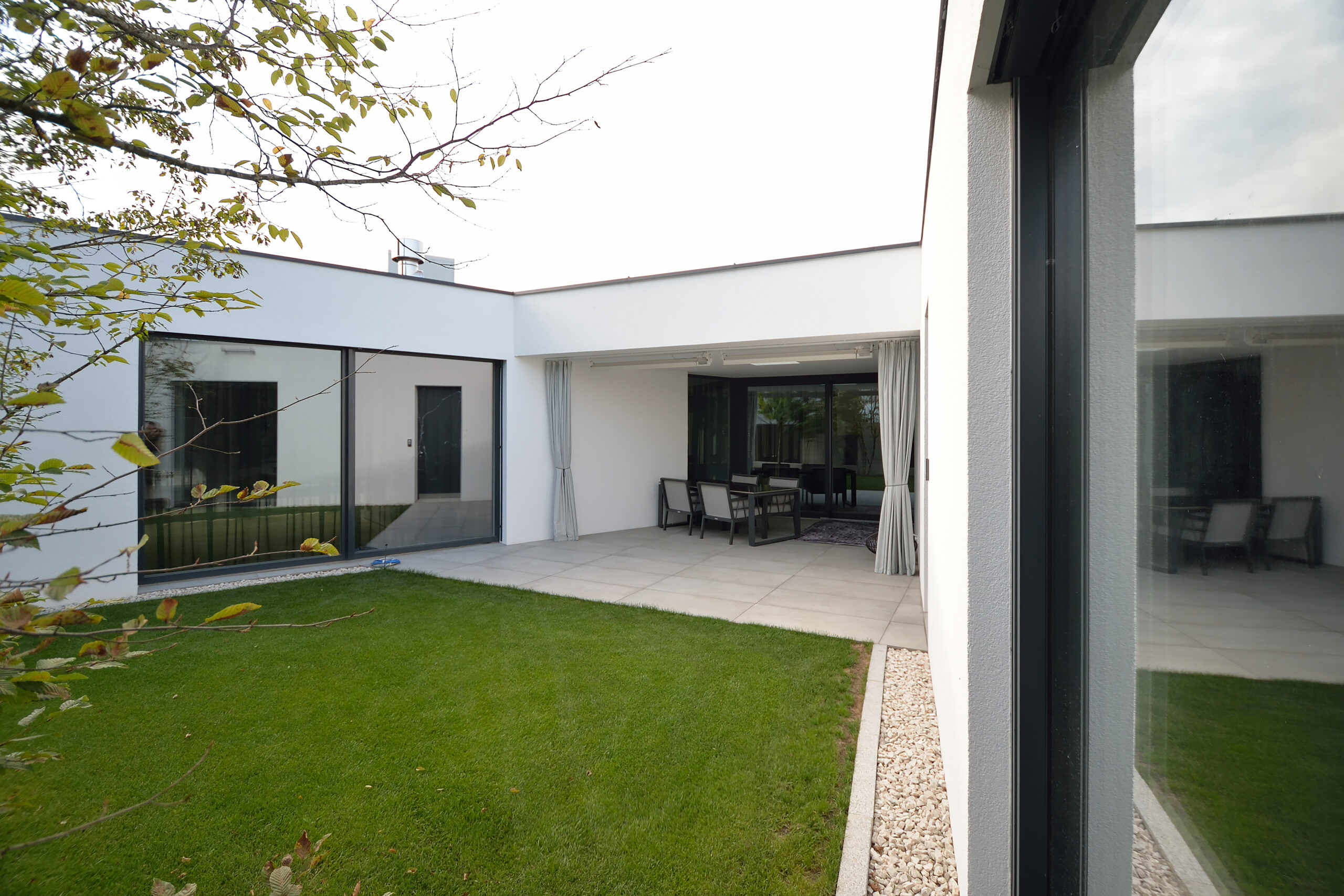 Reduzierte Formen und natürliche Oberflächen schaffen eine ruhige, elegante Atmosphäre, die sich über den Innenhof und den Poolbereich harmonisch nach außen fortsetzt.