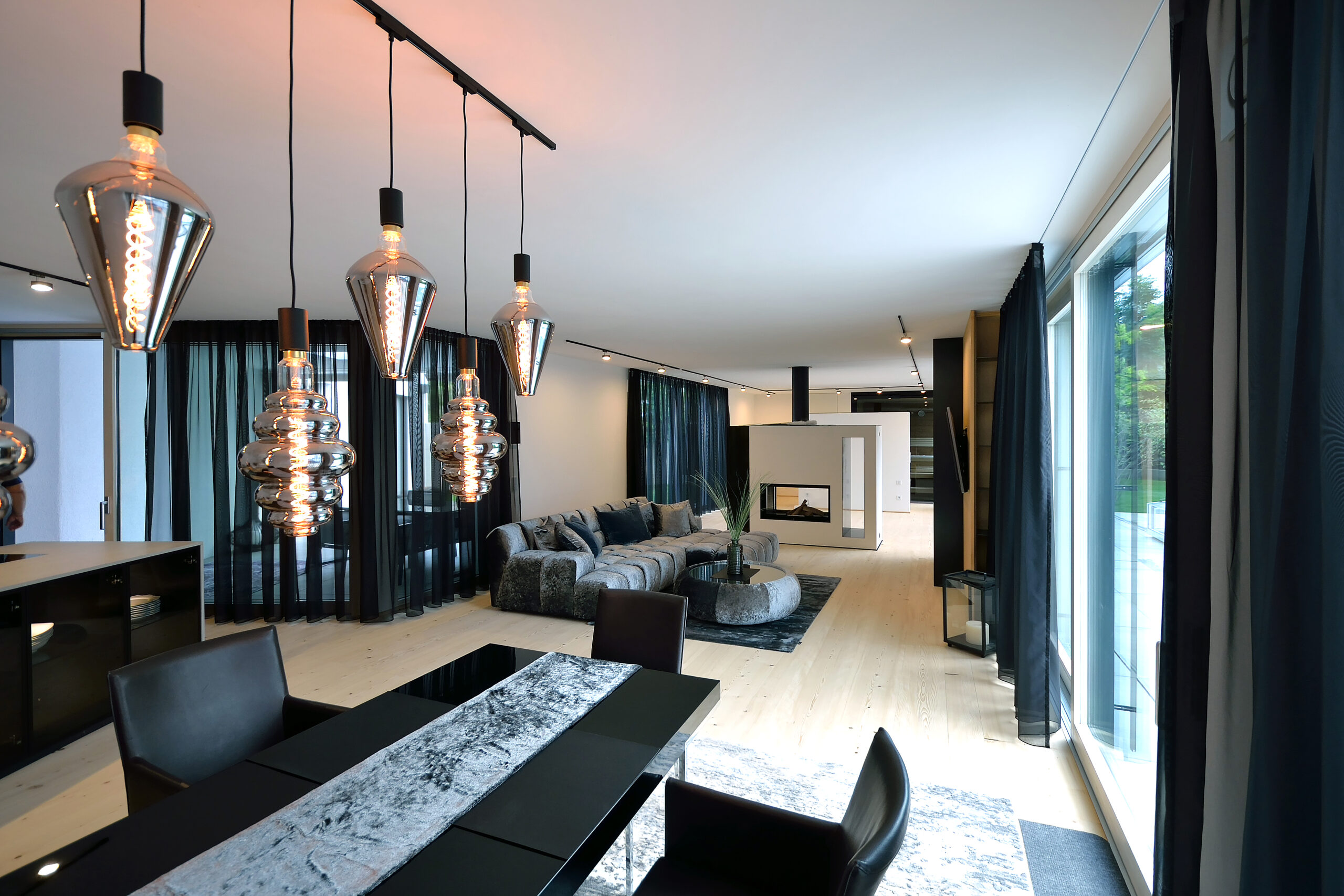 Dieser moderne Bungalow besticht durch klare Linien, große Glasflächen und ein offenes Raumkonzept mit Loft-Charakter. Innen gehen Wohnen, Essen und Kochen fließend ineinander über – strukturiert durch Licht, Materialien und den zentralen Kamin als Mittelpunkt.