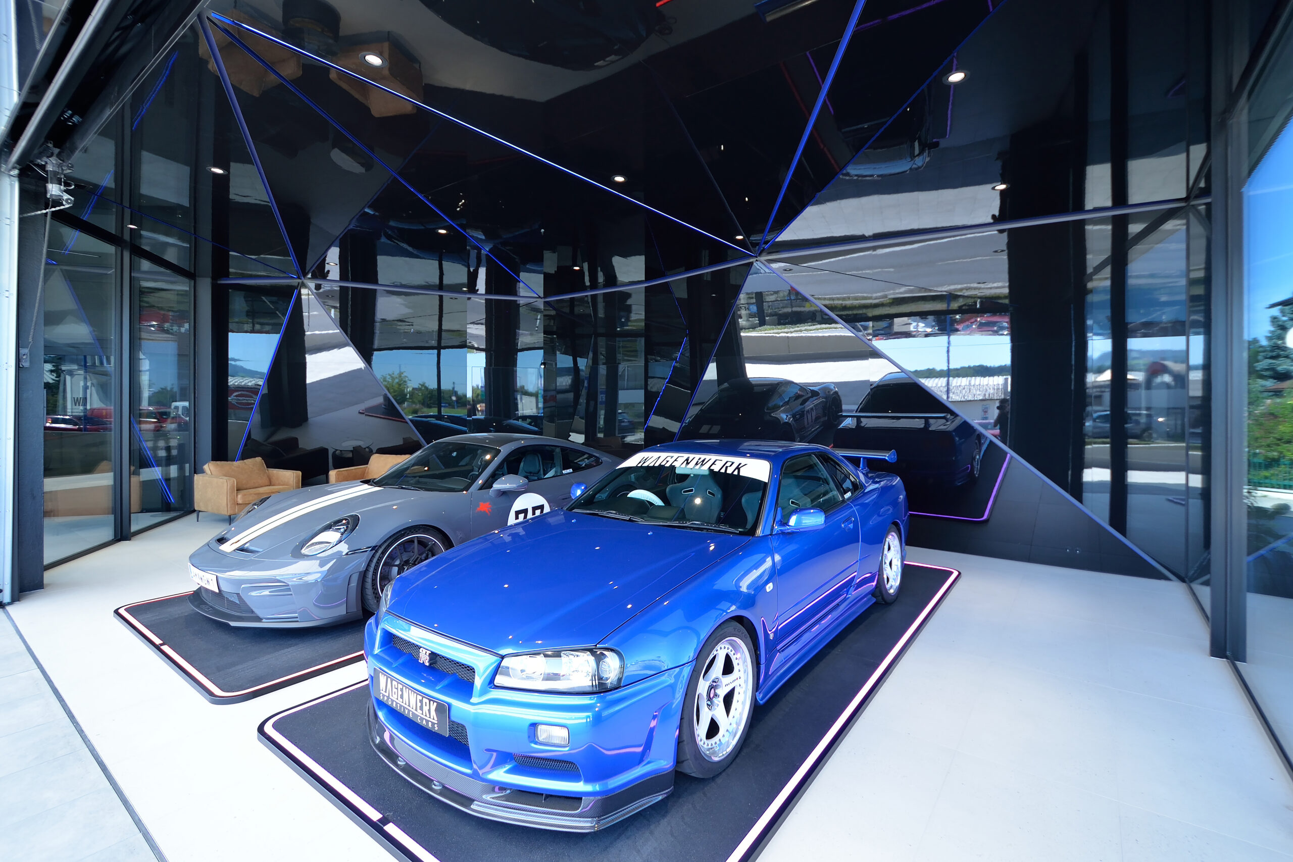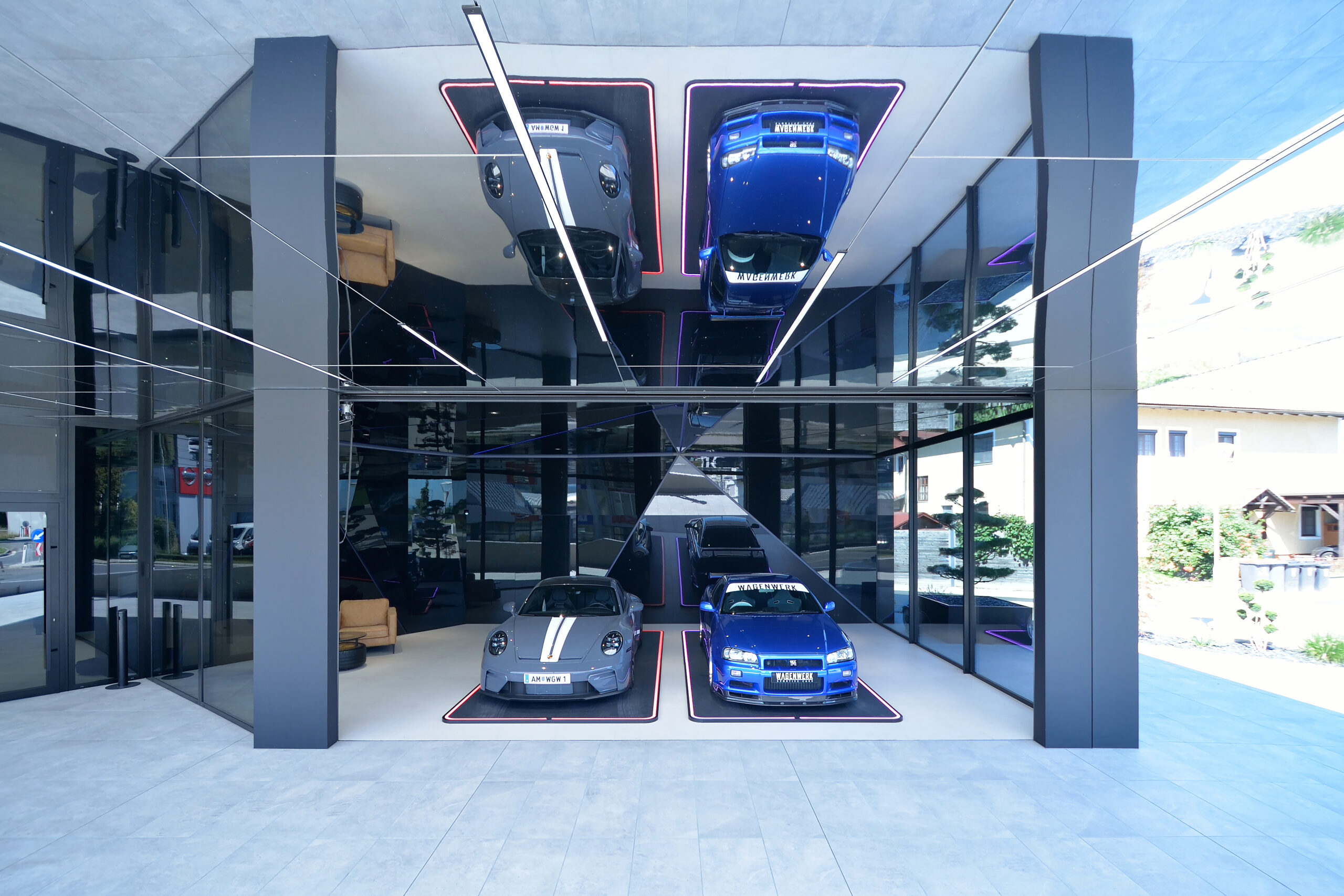 Innen schaffen metallische und verspiegelte Oberflächen ein Spiel aus Reflexionen, das die Hypercars spektakulär in Szene setzt. Architektur und Fahrzeug verschmelzen zu einer Einheit – Ausdruck von Leidenschaft und Perfektion.