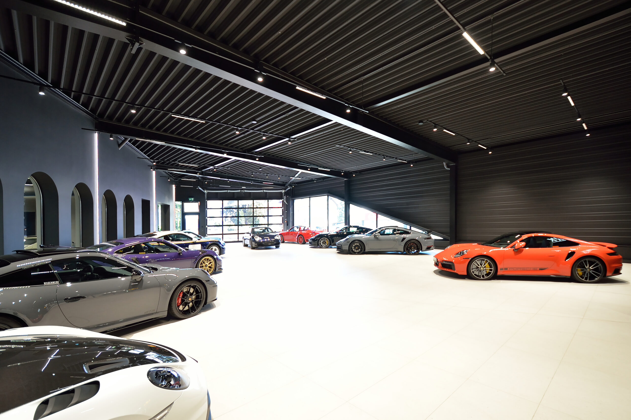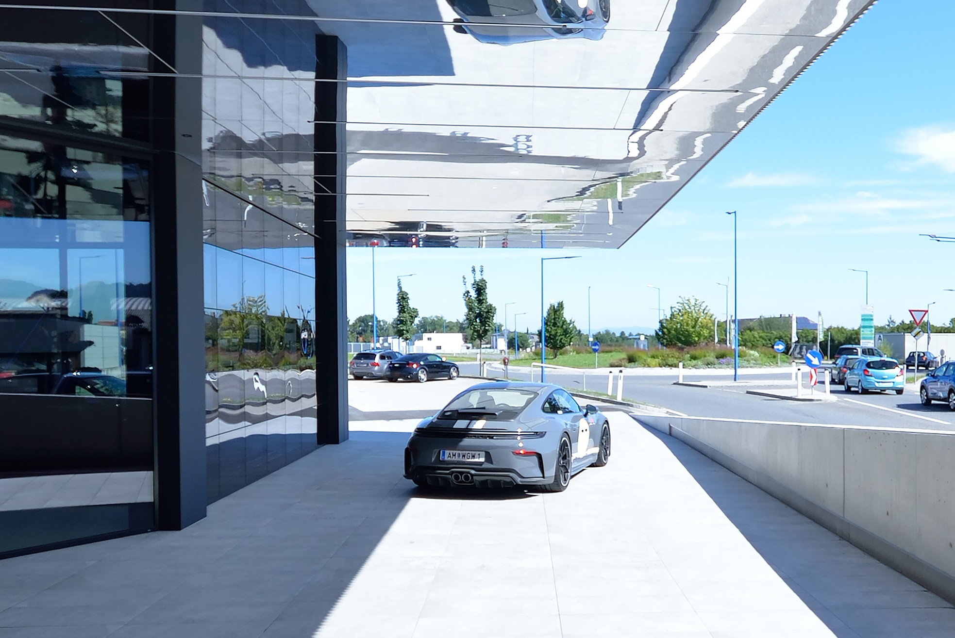 Großzügige Glasflächen und tiefschwarze Aluminiumrahmen verbinden Innen- und Außenraum zu einem klaren, eleganten Gesamtkonzept. Neben dem Schauraum umfasst der Neubau eine Garage für Fahrzeugaufbereitung sowie eine Auslieferungsbox für drei Fahrzeuge.