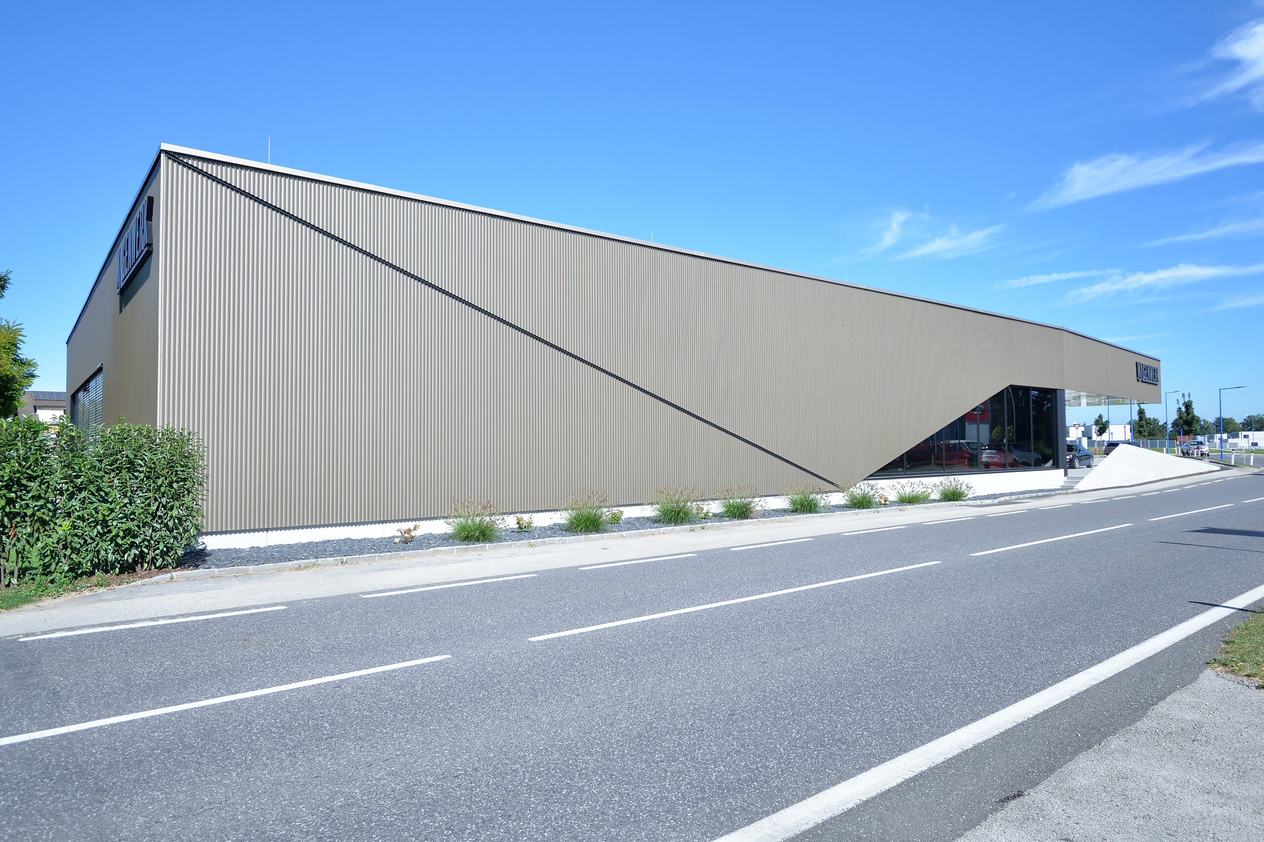 Ein neuer 500 m² großer Schauraum ergänzt den bestehenden Verkaufsbereich. Die leichte Stahlkonstruktion mit champagnerfarbener Metallfassade und präzise gefalteten Aluminiumflächen spiegelt technische Perfektion und Bewegung wider.